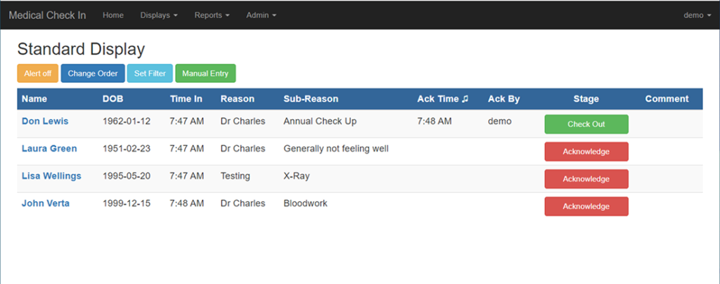 As patients arrive their information is sent to the live displays, a checklist for the entire staff to see who’s in, who’s next and who’s helping who. When staff click acknowledge, it time stamps the entry and adds the staff name that marked the point. When the last point is clicked, Check Out, the patient is removed form the active list. The entry is stored for long term reporting and documentation.